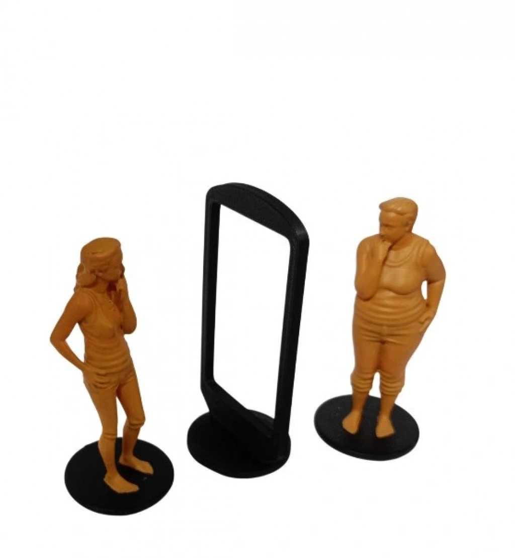 3 parçalı set. Vücut imajıyla ilgili güvensizlik ve kaygı duygularını yakalayın. Endişeli bir pozdaki bir kadın, aynı kadının daha büyük bir versiyonu ve ayakta duran bir "ayna". Bu parçalar birlikte veya ayrı ayrı kullanılabilir.