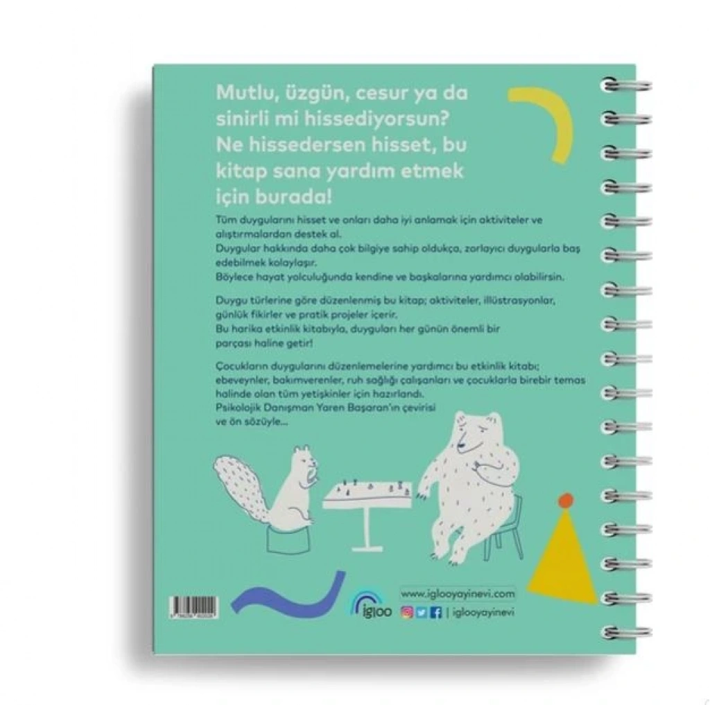 Mutlu, üzgün, cesur ya da sinirli mi hissediyorsun? Ne hissedersen hisset, bu kitap sana yardım etmek için burada! Tüm duygularını hisset ve onları daha iyi anlamak için aktiviteler ve alıştırmalardan destek al. Duygular hakkında daha çok bilgiye sahip oldukça, zorlayıcı duygularla baş edebilmek kolaylaşır. Böylece hayat yolculuğunda kendine ve başkalarına yardımcı olabilirsin. Duygu türlerine göre düzenlenmiş bu kitap aktiviteler, illüstrasyonlar, günlük fikirler ve pratik projeler içerir. Bu harika etkinlik kitabıyla, duyguları her günün önemli bir parçası haline getir! Çocukların duygularını düzenlemelerine yardımcı bu etkinlik kitabı ebeveynler, bakım verenler, ruh sağlığı çalışanları ve çocuklarla birebir temas halinde olan tüm yetişkinler için hazırlandı. Psikolojik Danışman Yaren Başaran’ın çevirisi ve ön sözüyle…