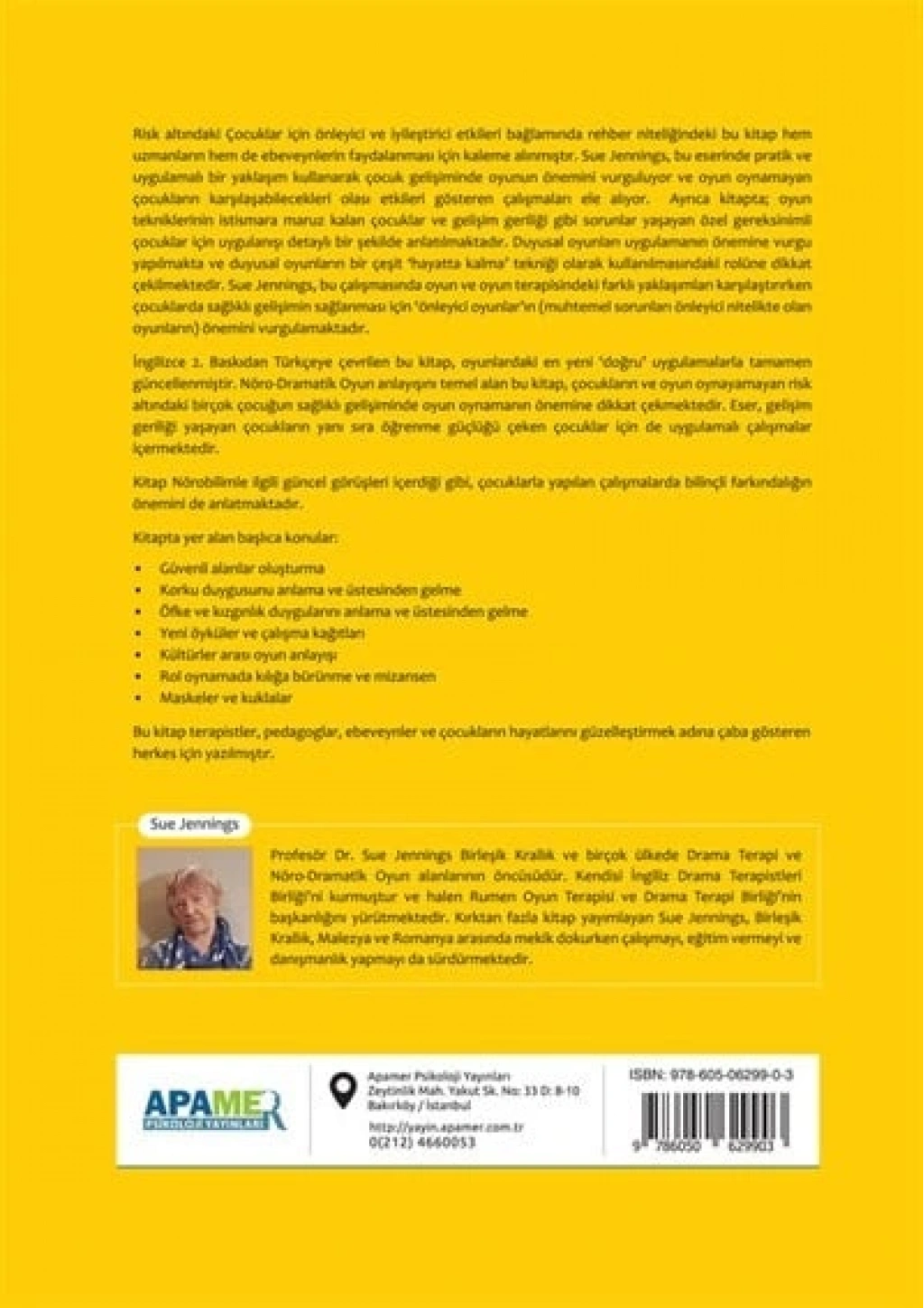 Özel çocuklar için oyun terapisi uygulama aktiviteleri içeren bu kitap son derece özel bir kaynaktır. Risk altındaki Çocuklar için önleyici ve iyileştirici etkileri bağlamında rehber niteliğindeki bu kitap hem uzmanların hem de ebeveynlerin faydalanması için kaleme alınmıştır. Sue Jennings, bu eserinde pratik ve uygulamalı bir yaklaşım kullanarak çocuk gelişiminde oyunun önemini vurguluyor ve oyun oynamayan çocukların karşılaşabilecekleri olası etkileri gösteren çalışmaları ele alıyor. Ayrıca kitapta; oyun tekniklerinin istismara maruz kalan çocuklar ve gelişim geriliği gibi sorunlar yaşayan özel gereksinimli çocuklar için uygulanışı detaylı bir şekilde anlatılmaktadır. Duyusal oyunları uygulamanın önemine vurgu yapılmakta ve duyusal oyunların bir çeşit ‘hayatta kalma’ tekniği olarak kullanılmasındaki rolüne dikkat çekilmektedir. Sue Jennings, bu çalışmasında oyun ve oyun terapisindeki farklı yaklaşımları karşılaştırırken çocuklarda sağlıklı gelişimin sağlanması için ‘önleyici oyunlar’ın (muhtemel sorunları önleyici nitelikte olan oyunların) önemini vurgulamaktadır. İngilizce 2. Baskıdan Türkçeye çevrilen bu kitap, oyunlardaki en yeni ‘doğru’ uygulamalarla tamamen güncellenmiştir. Nöro-Dramatik Oyun anlayışını temel alan bu kitap, çocukların ve oyun oynayamayan risk altındaki birçok çocuğun sağlıklı gelişiminde oyun oynamanın önemine dikkat çekmektedir. Eser, gelişim geriliği yaşayan çocukların yanı sıra öğrenme güçlüğü çeken çocuklar için de uygulamalı çalışmalar içermektedir. Kitap Nörobilimle ilgili güncel görüşleri içerdiği gibi, çocuklarla yapılan çalışmalarda bilinçli farkındalığın önemini de anlatmaktadır.
