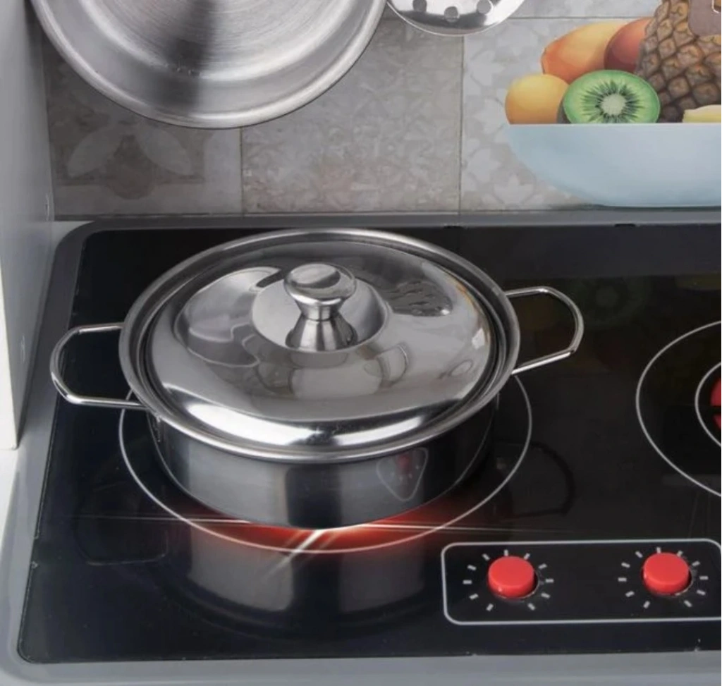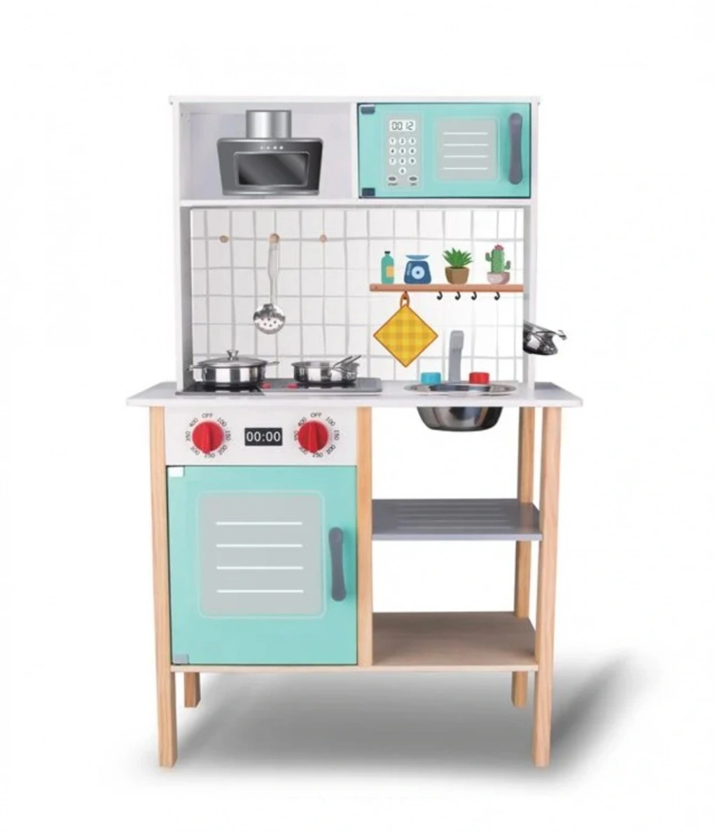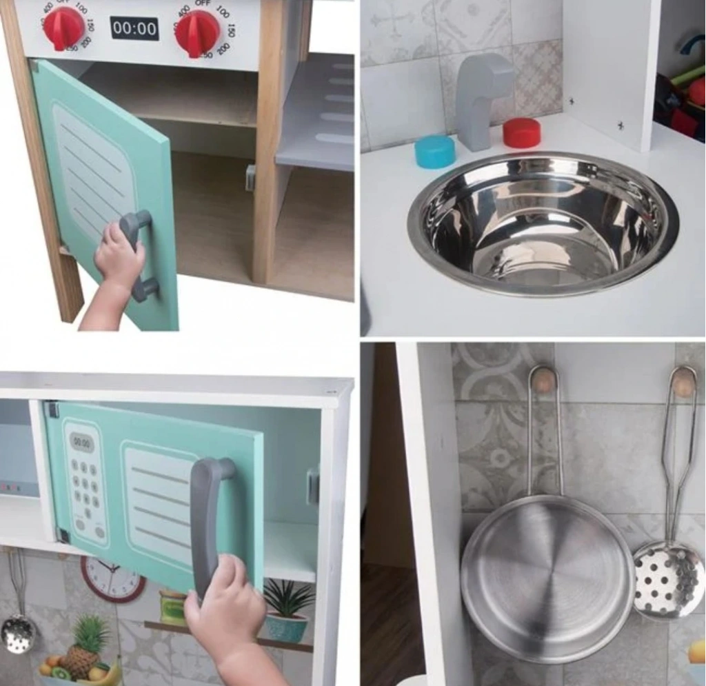 5 metal aksesuarlı, ışıklı ve sesli ahşap mutfak oyuncağı. Hem eğlenmenin hem de öğrenmenin harika bir yolu. Elektrikli ışıklı ocak ve gerçekçi pişirme sesleri gibi birçok fonksiyona sahip. Mikrodalga fırın ve düğmelerle ışık saçan bir mutfak içeriyor! Sonsuz pişirme için 5 metal aksesuar içerir.
